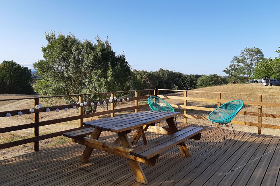 Devant votre tipi vous attend une grande terrasse en bois orientée vers le soleil couchant.